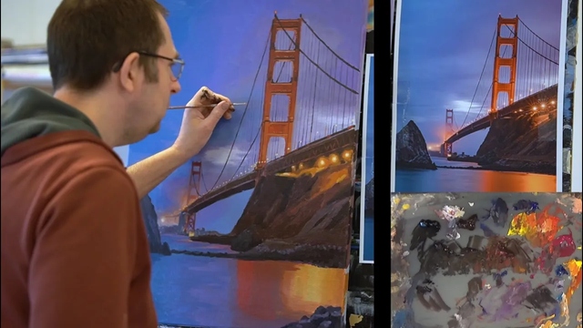 Painting the Golden Gate Bridge with acrylics.